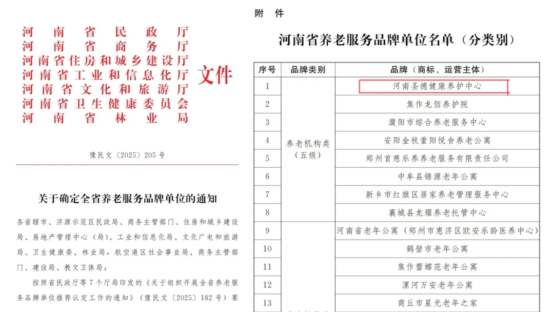 2025年河南省养老服务品牌单位发布 河南圣德健康养护中心斩获养老机构类**名